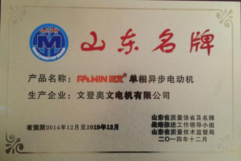 月,奥文电机系列单相异步电动机产品被山东省质量技术监督局、山东省名牌战略推进委员会授予山东名牌产品。