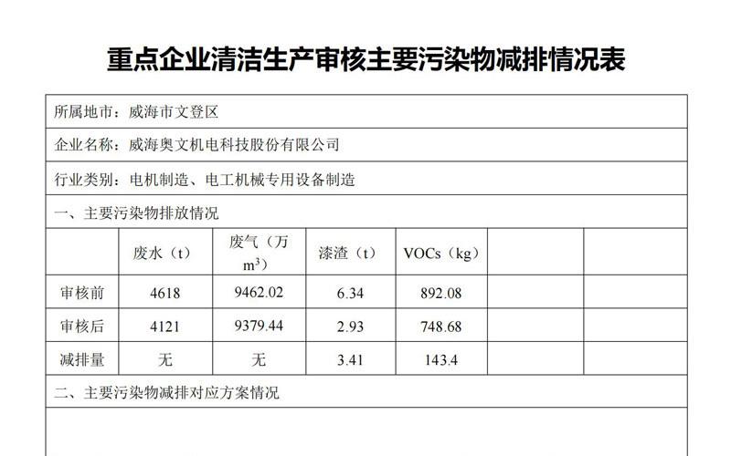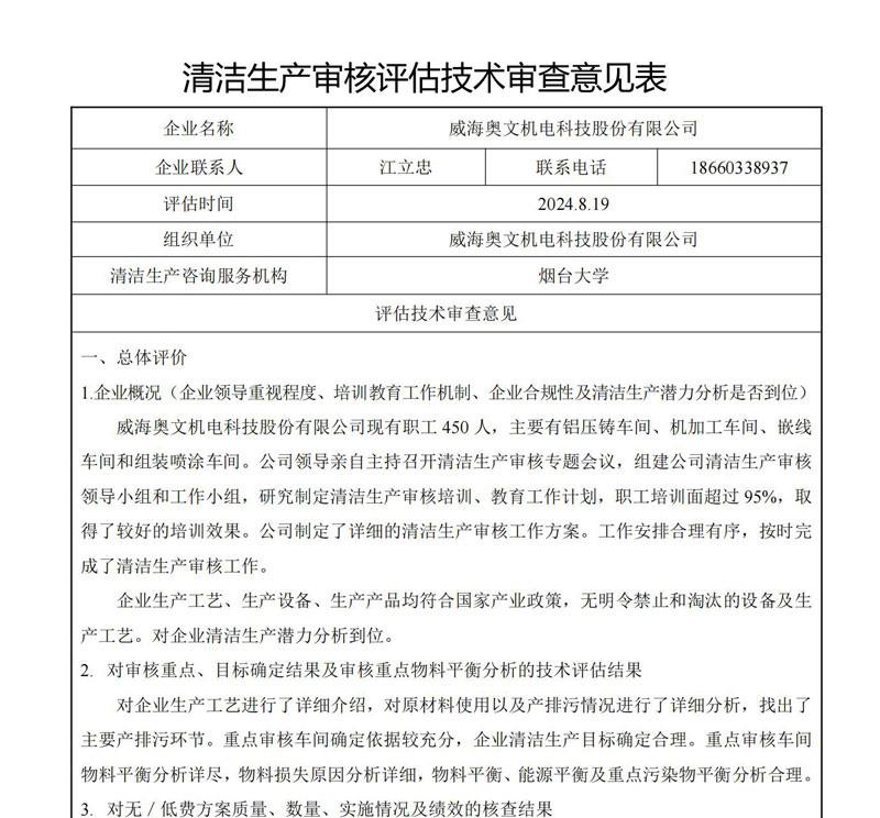 威海奥文机电科技股份有限公司主要产品主要产品为各型号电机和电动工具,主要原辅材料包括:硅钢板、铝锭、普通钢板、圆钢、漆包线、水性油漆、天然气、水、电等。公司重点监管对象是废水和废气,主要污染物是COD、颗粒物、VOCs,为深入贯彻落实《中华人民共和国清洁生产促进法》,根据原国家环保总局《关于印发重点企业清洁生产审核程序的规定的通知》(环发[2005]151号)、《环境保护部关于进一步加强重点企业清洁生产审核工作的通知》(环发[2008]60号)、《关于深入推进重点企业清洁生产的通知》(环发[2010]54号)和《山东省生态环境厅关于下达2024年度山东省实施强制性清洁生产审核企业名单的通知》(鲁环字[2024]48号)等文件要求。公司于2024年5月至2024年10月开展了清洁生产审核。