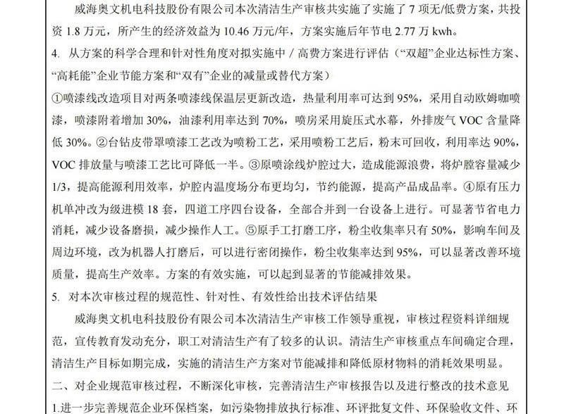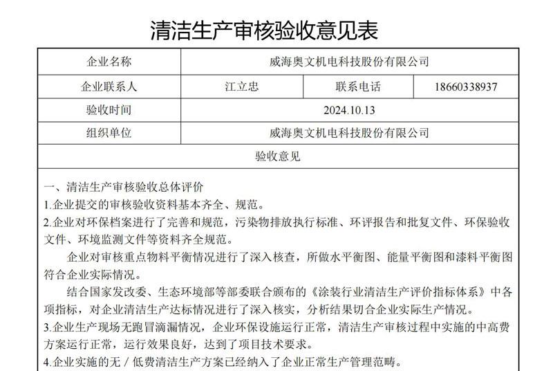 威海奥文机电科技股份有限公司清洁生产验收情况公示