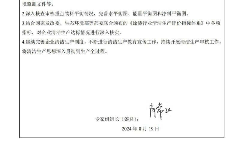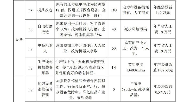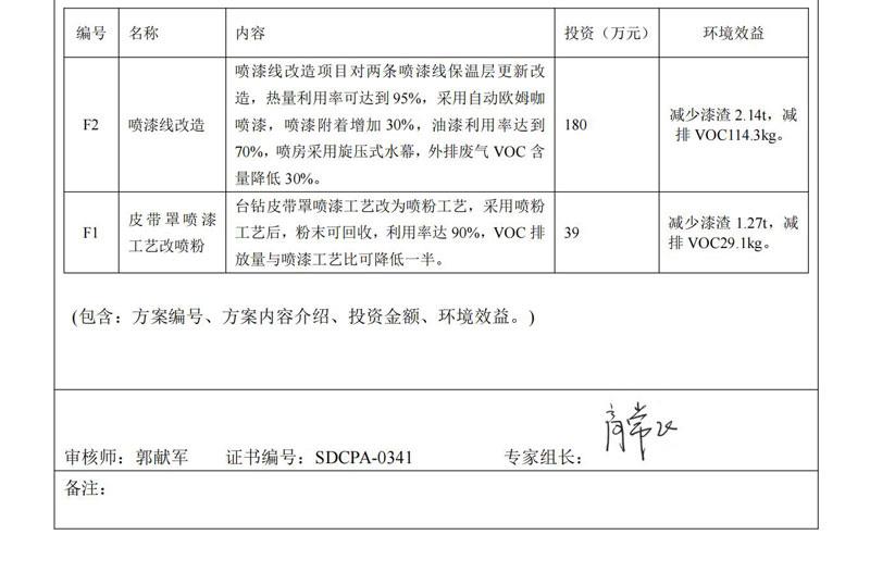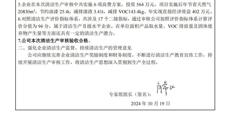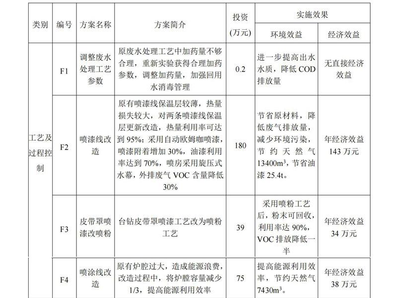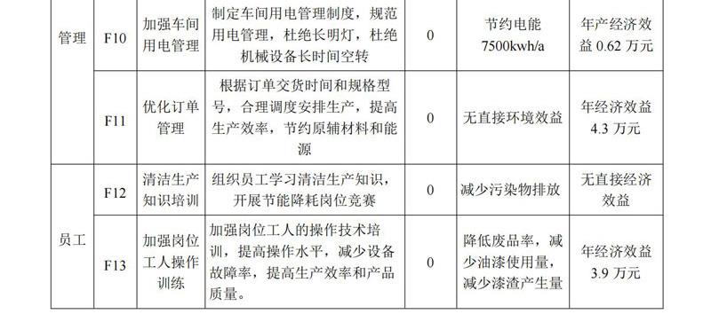本次清洁生产审核已实施了7项无/低费方案、6项中/高费方案,共投资565.8万元,所产生的经济效益为412.46万元/年,方案实施后年节电27700kWh,年节省油漆25.4t,节省天然气20830m3,年减排漆渣3.41t,减排VOC143.4kg。